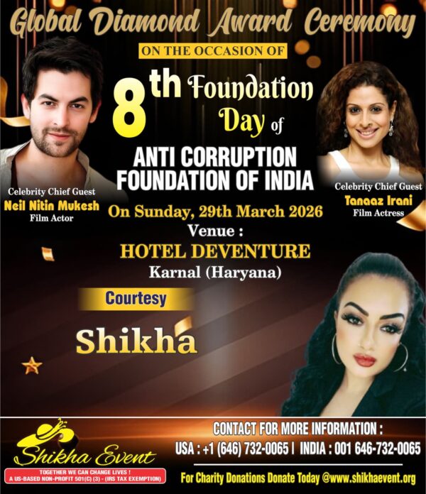 On the occasion of the 8th Foundation Day of the Anti Corruption Foundation of India, we are proud to host a prestigious celebration dedicated to integrity, service, and social impact, graced by celebrity chief guests Neil Nitin Mukesh Film Actor and Tanaaz Irani Film Actress.
